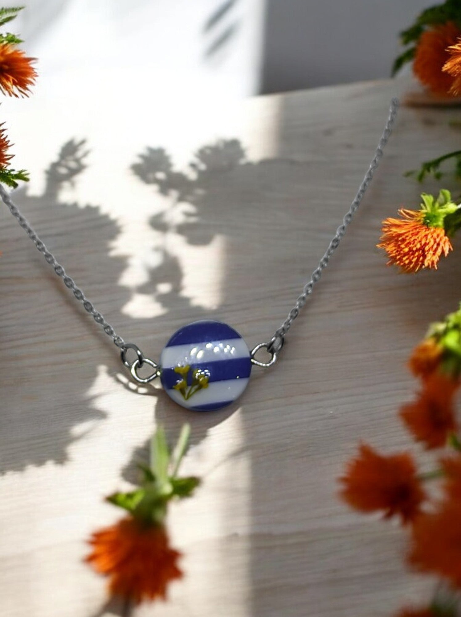 Ce bracelet original associe l’élégance intemporelle de la marinière et la délicatesse d’une fleur de carotte sauvage, symbole de pureté, de simplicité et d’inspiration. Préservée sous résine au cœur d’un cercle aux rayures bleu et blanc, cette fleur naturelle vient illuminer le design marin d’une touche florale poétique.