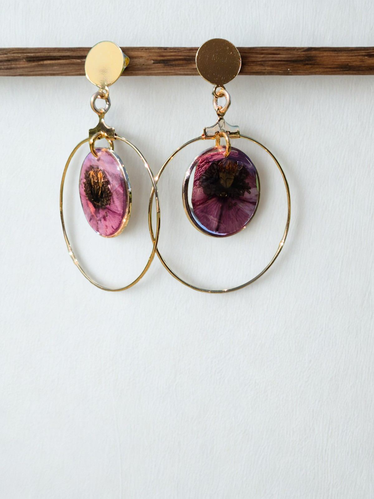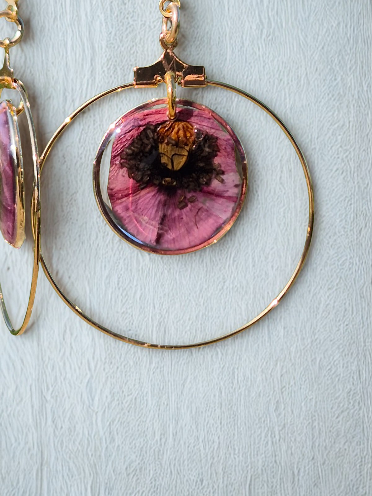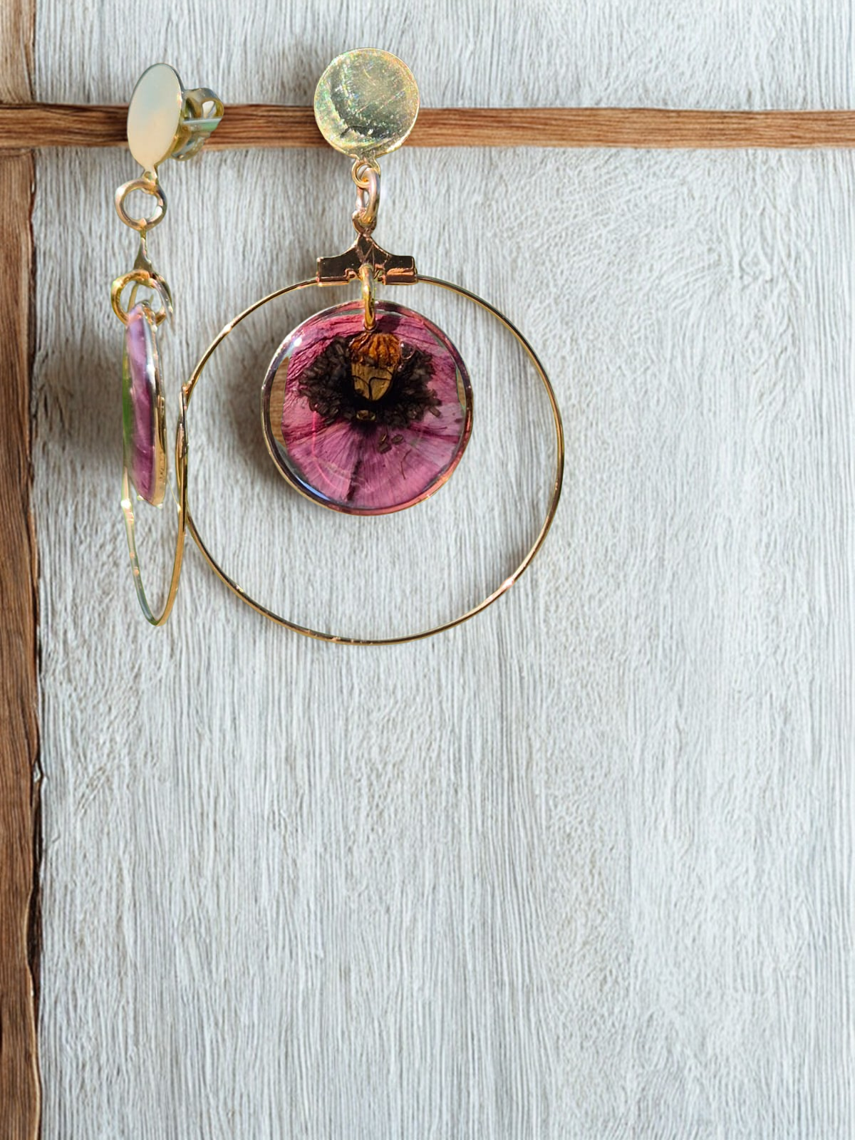 Ces créoles lumineuses célèbrent la poésie des champs avec un cœur de fleur de coquelicot, délicatement préservé dans un cercle résiné. Symbole d’amour, de vitalité et d’éphémère, le coquelicot se fait ici bijou raffiné et intemporel, à porter comme une véritable ode à la nature sauvage.