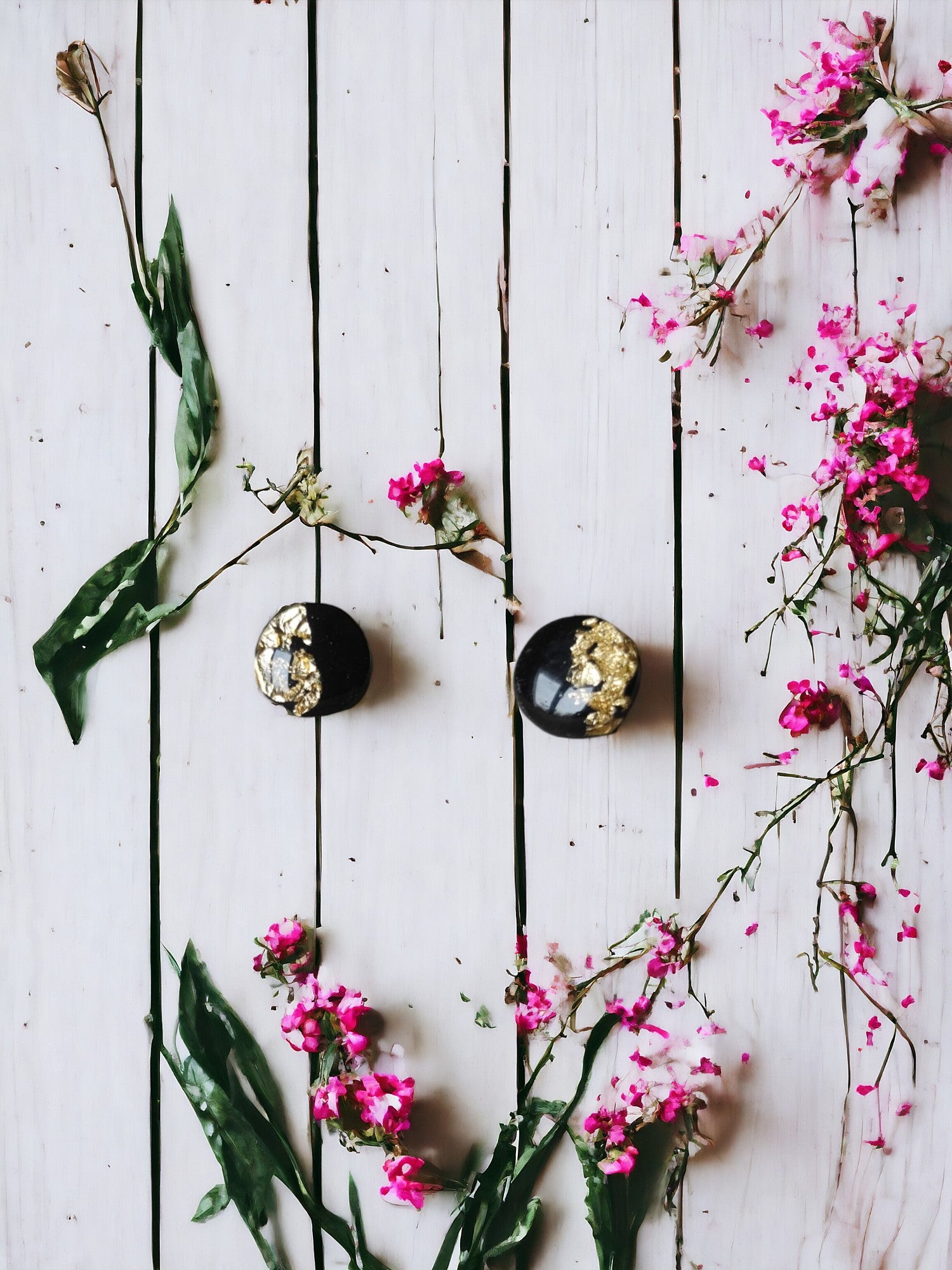 Les puces d'oreilles, d'une forme ronde et d'un noir profond, sont accentuées par de délicates feuilles d'or.